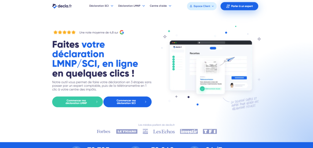 Spécialiste des SCI et LMNP, decla.fr est une alternative aux experts-comptables pour LMNP, puisque cette solution vous permettra de réaliser vos déclarations en ligne seul, rapidement et simplement.