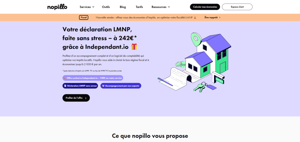 Nopillo est un acteur qui sort un peu du lot parmi notre sélection, puisque c’est un outil qui vous permet de réaliser vos déclarations LMNP seul et en toute simplicité, et de bénéficier jusqu’à 2 000€ de réduction d’impôts grâce au régime réel.